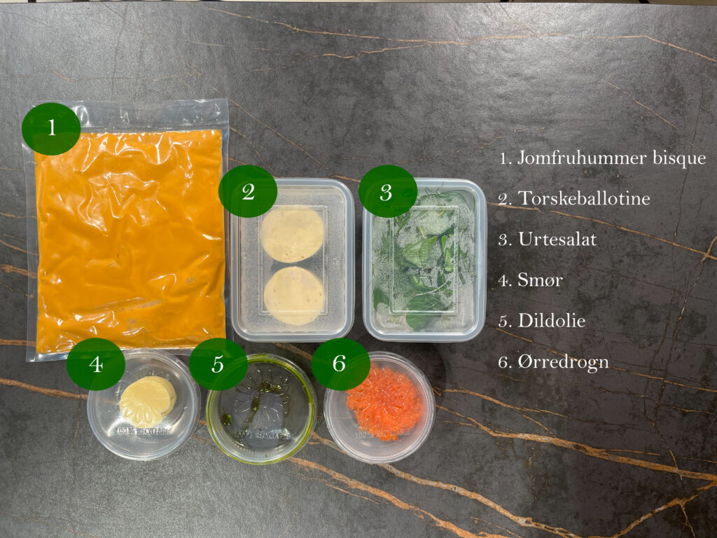 Torskeballotin med jomfruhummer bisque, mættet med ørredrogn og aromatisk dildolie, anrettet med spæd urtesalat. Hertil hjemmebagt brød og smør.