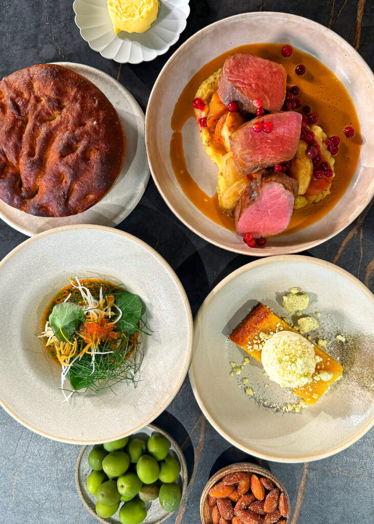 Rosa oksefilet med grov kartoffelkompot, syltede tyttebær, vintergrønt og madagascar pebersauce.